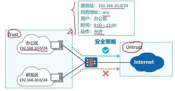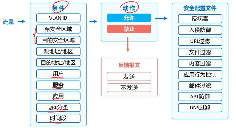 安全策略是控制防火墙对流量转发以及对流量进行内容安全一体化检测的策略。