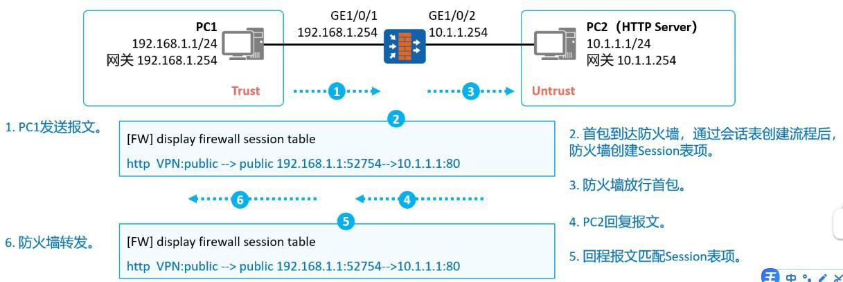 会话表是用来记录TCP、UDP、ICMP等协议连接状态的表项,是防火墙转发报文的的重要依据。
