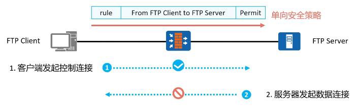 如果在防火墙上配置严格的单向安全策略,那么防火墙将只允许业务单方向发起访问。这会导致一些特殊的协议无法工作,例如FTP。