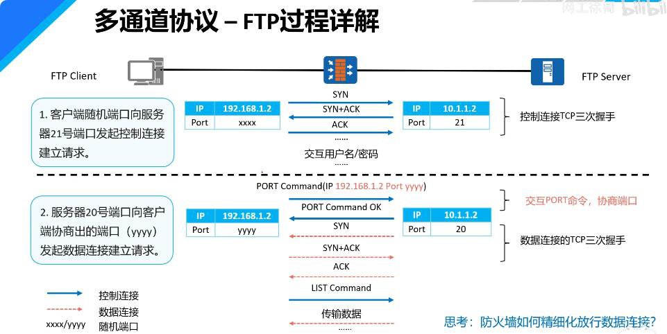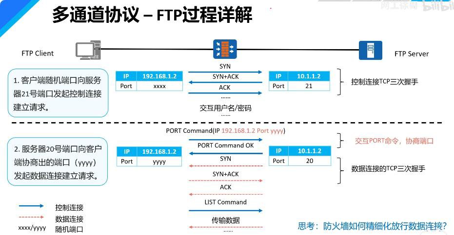 同FTP,通信过程中需占用两个或两个以上端口的协议被称为多通道协议。多通道协议都需要考虑此类问题。