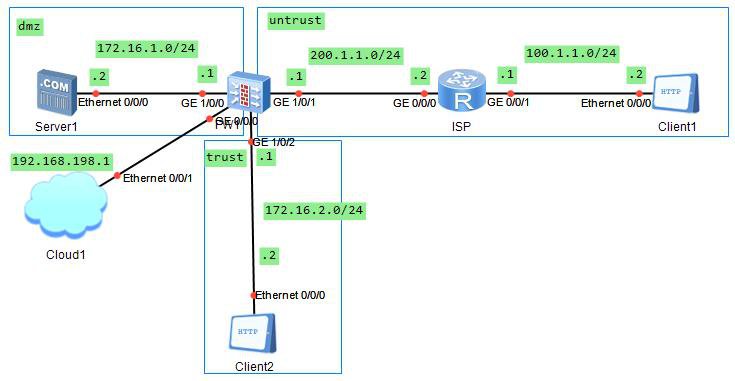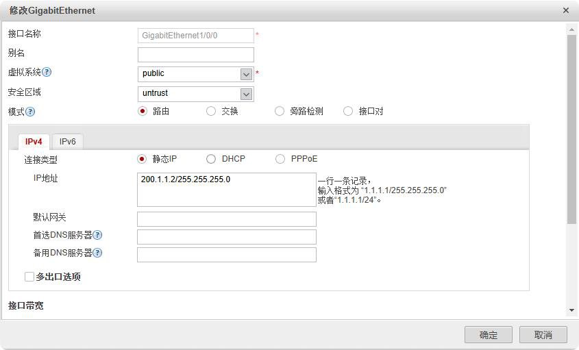 网络--接口--G1/0/1--安全区域untrust--IP地址200.1.1.2/24--确定