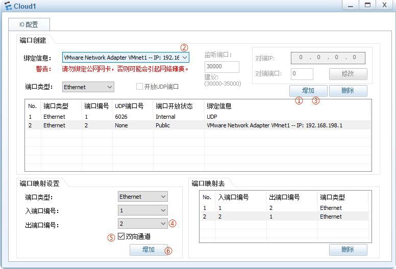 3.在端口映射设置-出端口编号-下拉选2,勾选双向通道,再点增加。
