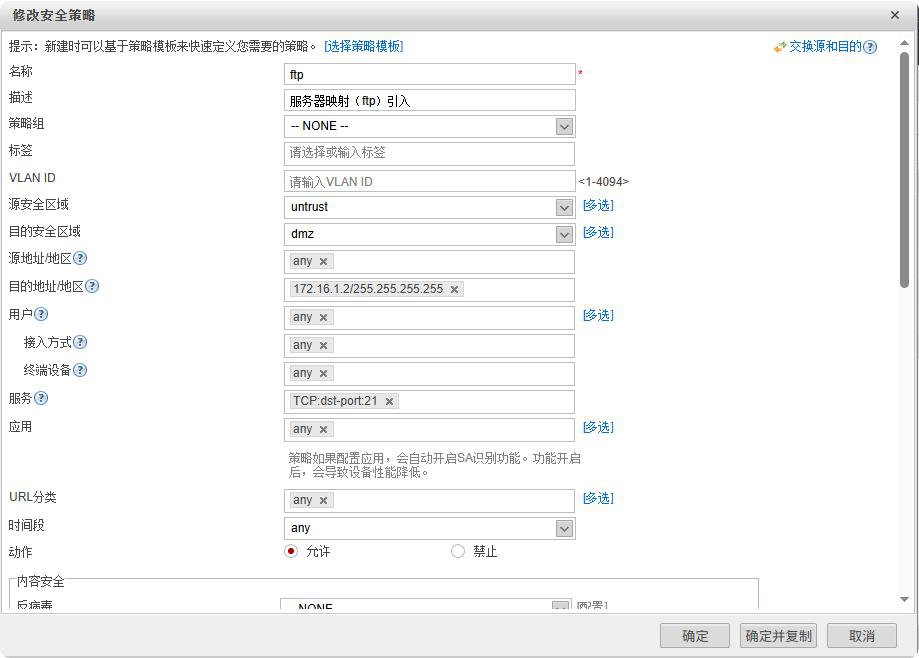 [USG6000V1-policy-security-rule-untrust_dmz]service ftp