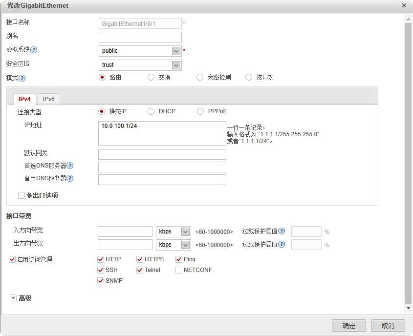 网络--接口--G1/0/1--安全区域trust--IP地址10.0.100.1/24--启用访问管理HTTP、HTTPS、Ping、SSH、Telnet、SNMP--确定