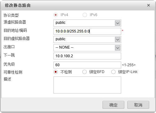 网络--路由--静态路由--目的地址/掩码10.0.0.0/16--下一跳10.0.100.2--确定