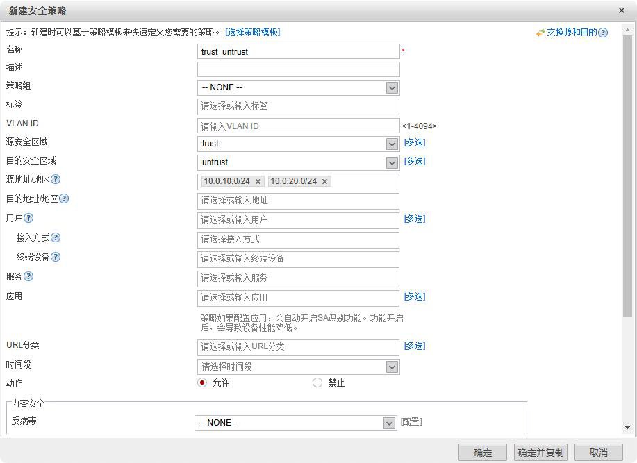 策略--安全策略--新建安全策略--名称trust_untrust--源安全区域trust--目的安全区域untrust--源地址/地区10.0.10.0/24 10.0.20.0/24--动作允许--确定