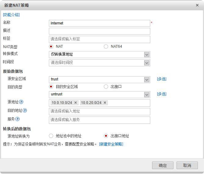 策略--NAT策略--新建--名称Internet--NAT类型NAT--源安全区域trust--目的类型,目的安全区域untrust--源地址10.0.10.0/24 10.0.20.0/24--转换后的数据包,出接口地址--确定