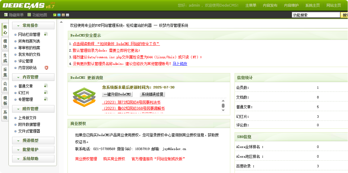 ⑥在浏览器地址栏输入http://xxxxxxx.xyz/dede点击系统-数据库备份/还原-开始还原;系统-系统基本参数-站点根网址-http://xxxxxxx.xyz-确定;出现域名登录后台;生成-更新系统缓存-√检测并清理错误文档-开始执行;生成-一键生成网站-√更新所有-开始更新;更新主页-HTML-√生成静态-更新主页HTML。OK!网站全部搞定!